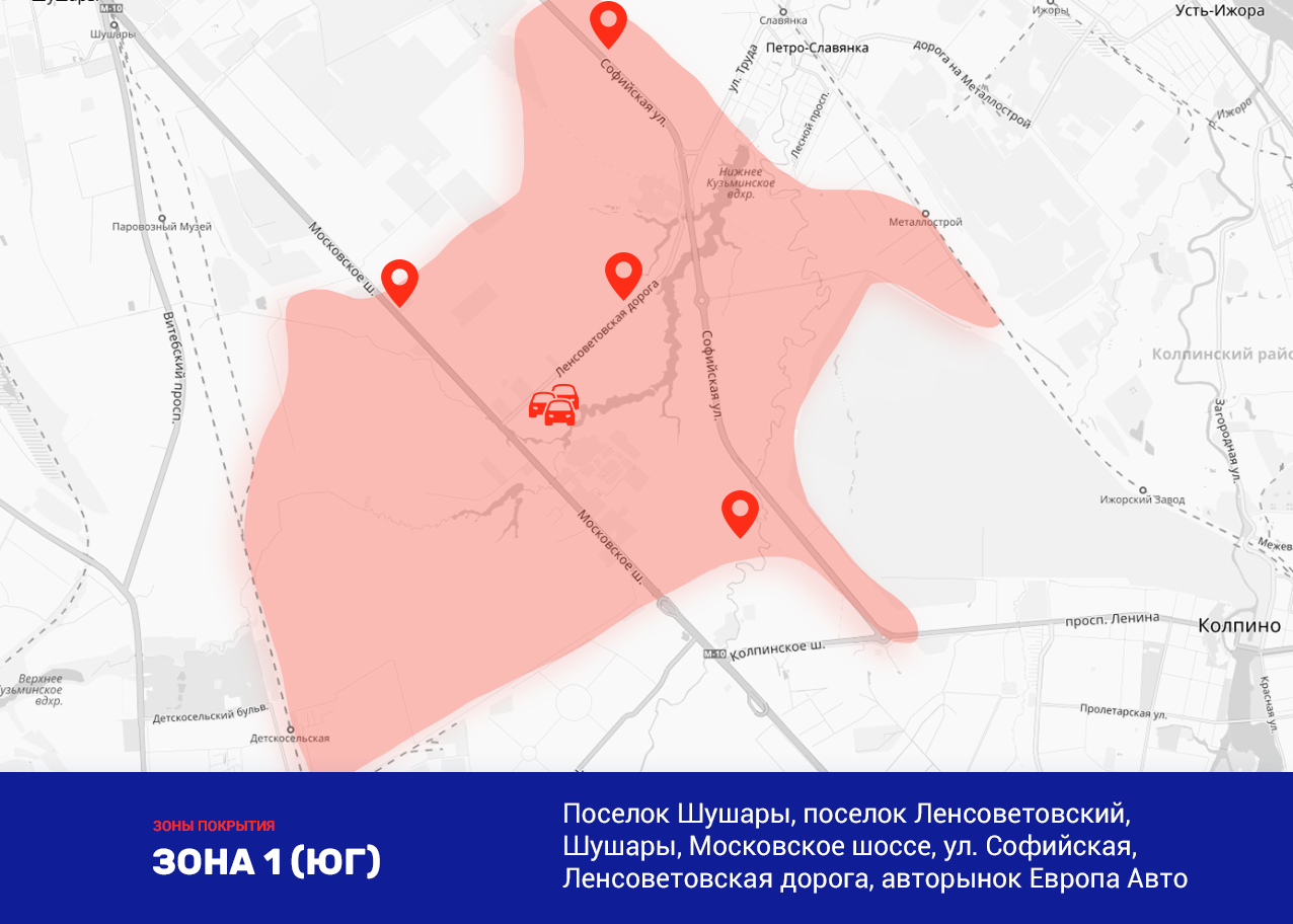 зоны покрытия ЮГ Поселок ШушарыПоселок ЛенсоветовскийШушары, Московское шоссеул. Софийская Ленсоветовская дорогаАвторынок Европа Авто